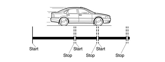 The illustration above shows an example of a driving cycle or operation cycle. The vehicle is started and driven (Start), is stopped sometime and the ignition is turned off (Stop). When the ignition is turned on again (Start) a new driving cycle starts.