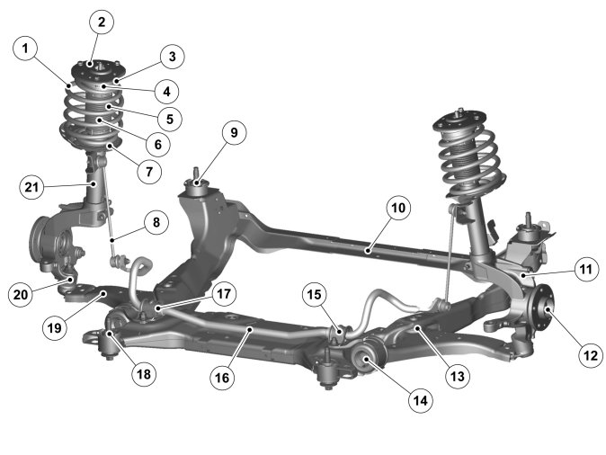 The spring strut consists of shock absorber (21), spring strut bearing (3) with auxiliary spring (5), boot (6), spring (1), upper and lower spring isolators (7), upper bearing (2), stub axle (11) and wheel bearing (12).