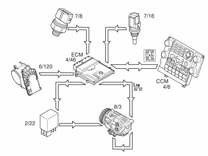 The climate control module (CCM) transmits information to the engine control module (ECM), which determines what must be prioritized. For example, the air conditioning (A/C) compressor in certain extreme cases is switched off completely, regardless of the climate control module (CCM) request. This is to prevent negative engine performance and to protect the air conditioning (A/C) system. As well as the information from the climate control module (CCM), the engine control module (ECM) controls the air conditioning (A/C) compressor based on the information from: