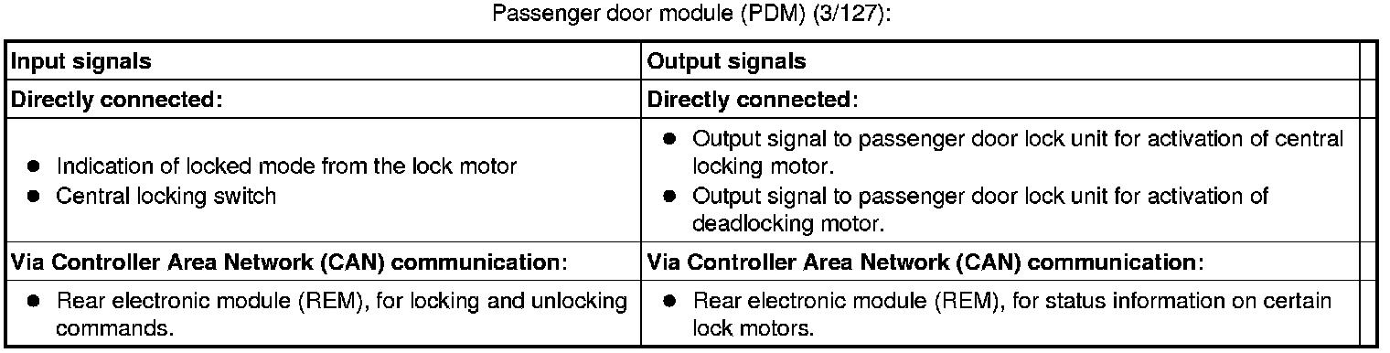 The tables below summarize the input and output signals to the units in the central locking function. The signal types are divided into directly connected signals and Controller Area Network (CAN) communication.