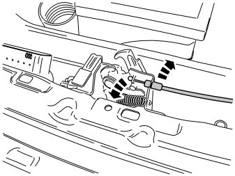 - Pull loose the wire sleeve and the wire from the mounting in the hood lock.