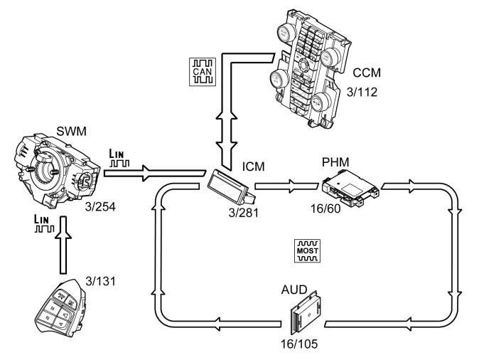 When using the menu via the steering wheel buttons information is transmitted from the steering wheel module (SWM) (3/254) to the infotainment control module (ICM) via LIN communication. The information is then transmitted to the phone module (PHM) via the MOST network.