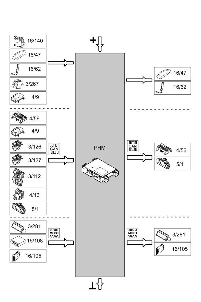 If the phone module (PHM) is not powered, there will be no MOST network communication and the system is switched off.