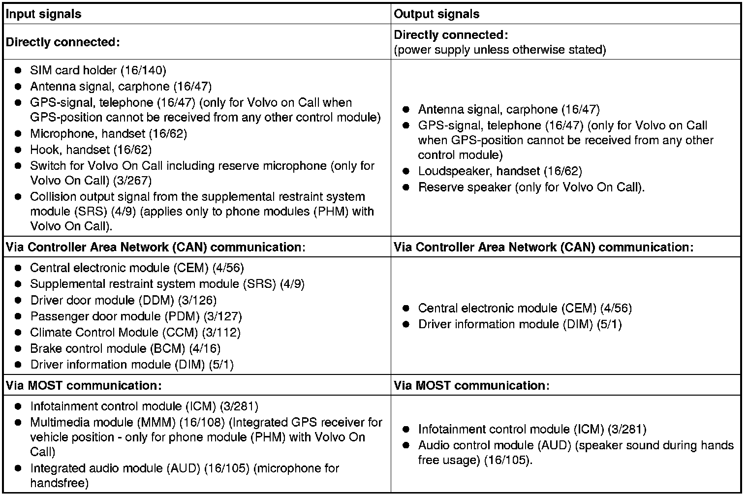 The following table summarizes the input signals to and output signals from the phone module (PHM). The signal types are divided into directly connected signals, MOST and CAN communication. The illustration below displays the same information with the Volvo component designations.