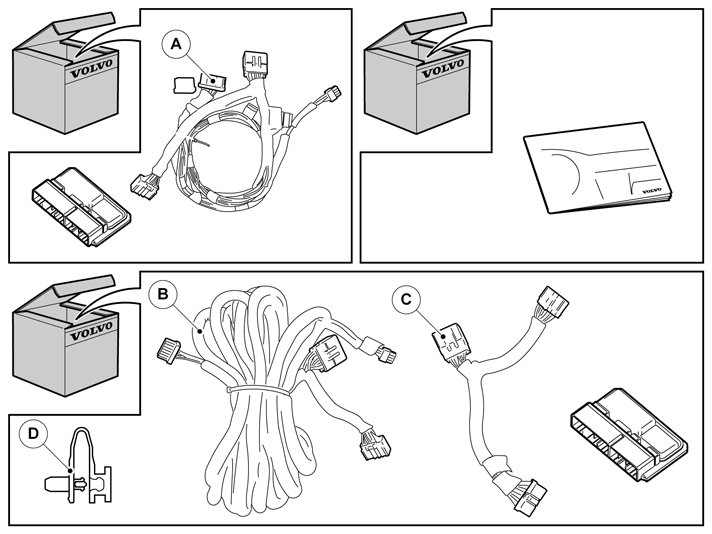 Note! Wiring A is for cars with an internal amplifier, which is located in the media player.Wiring B and C is for cars with an external amplifier, which is located on the right-hand front side of the rear seat.Cars with Performance Sound have internal amplifier.Cars with the High Performance and Premium Sound audio systems have external amplifier.There may be components in the accessories kit that are not used for this installation.