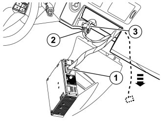 - Connect the gray connector (1) in the new cable harness to the corresponding socket in the media player.