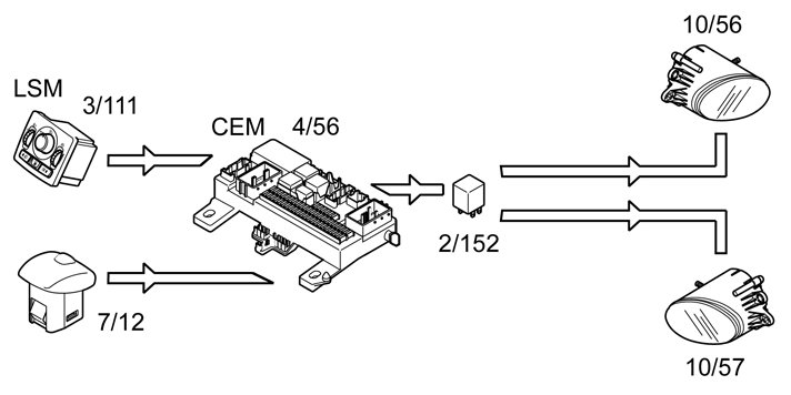 The front fog lamps (10/5-6) are activated by pressing the button for the front fog lamps in the light switch module (LSM) (3/111). The light switch module (LSM) is directly connected to the central electronic module (CEM) (4/56).