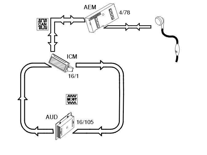 In the event of a call the accessory electronic module (AEM) (4/78) receives an input signal from the hands free unit (post installed) and forwards this on the Controller area network (CAN) to the infotainment control module (ICM) (16/1). The infotainment control module (ICM) transmits the signal in turn via the MOST network to the audio module (AUD) (16/105) which mutes the loudspeakers.