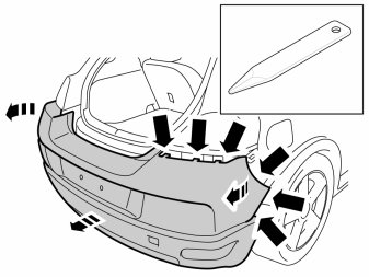 - Remove the bumper cover from the body by carefully prying off the ends using a weatherstrip tool. Pull off the cover under the tail lamp and from the rear edge of the wing on each side. It is secured by four clips at the tail lamp and four in the rear edge of the rear wing. Pull the bumper cover straight back.
