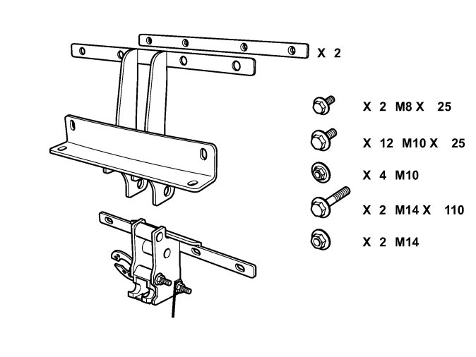 - Take the L profile, four flange screws M10x25 (1) and four M10 flange nuts from the kit. Install the L profile on the collision member. Do not tighten yet.