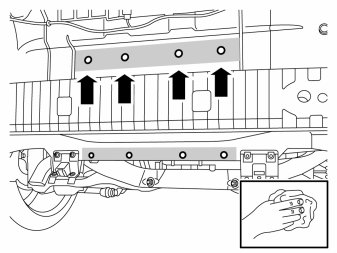 - Clean any dirt, remaining bodywork sealant or splashes of underbody sealant from the marked surfaces for the tow hitch mounting to the collision member on the underneath and front side.