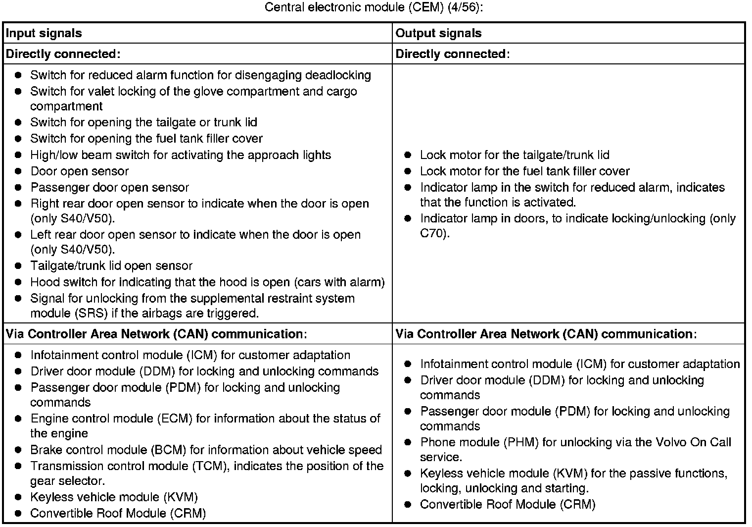 The tables below summarize the input and output signals to the units in the central locking system. The signal types are divided into directly connected signals, serial communication and controller area network (CAN) communication.