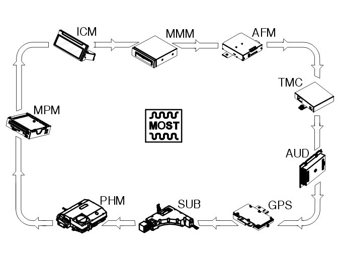 Data is transmitted via the fiber optics, for example music, in the form of light signals. The MOST network is a ring which must be unbroken for it to work. If a fiber optic breaks or a connector is not connected, none of the infotainment system components will work. The ends of the fibers must also be free of dirt so that the light is not obstructed.