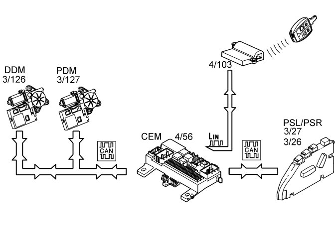 The signal from the remote control is transmitted to the central electronic module (CEM) (4/56) when the car is locked or unlocked. The central electronic module (CEM) also identifies which remote control is being used, stores this information and decides what information (see below) must be sent to: