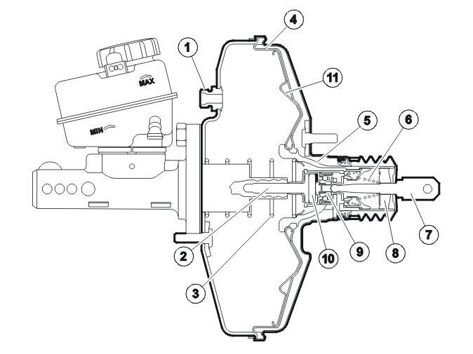 The vehicle is equipped with a single servo cylinder. It has integrated mechanical brake assistance (EBA). The servo cylinder is located between the brake pedal and the master cylinder and is actuated directly by the brake pedal. It ensures that less pedal force is required when braking with the aid of vacuum from the vacuum pump and via the intake manifold for the engine. The check valve located by the vacuum pump prevents air from flowing back to the servo cylinder.