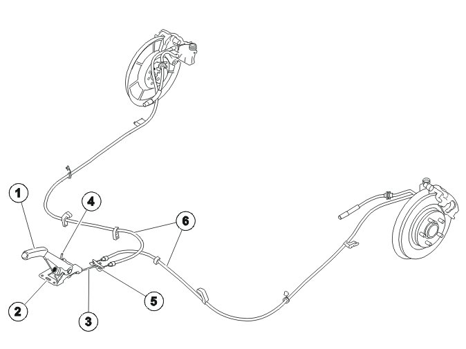 On the front end of the primary mechanical cable (3) is an adjuster nut (4) for manual adjustment of the cables. The primary mechanical cable is routed through a hole in the front floor to the compensator (5), where the two secondary mechanical cables (6) are mounted. The secondary mechanical cables are routed crosswise to the relevant brake caliper.