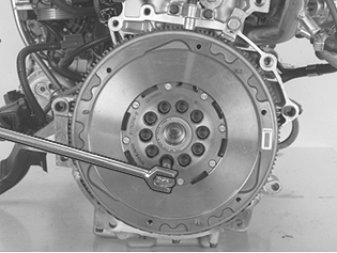 Hold the flywheel and carrier plate, and screw out the last screw.