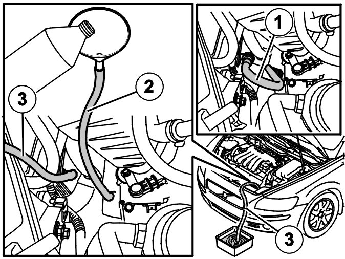 Fill approximately 2 liters of oil again as described above. Start the engine again. Allow the engine to idle so that the oil pump for the transmission pumps out the oil. Turn the engine off when air bubbles start to become visible in the hose.