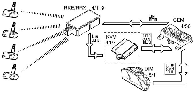 When the ignition is switched on the Remote Receiver Module (RRX) (Remote Keyless Entry (RKE) if the keyless function is installed) starts to listen for messages from the sensors. The signals transmit the receiver to the Central electronic module (CEM).
