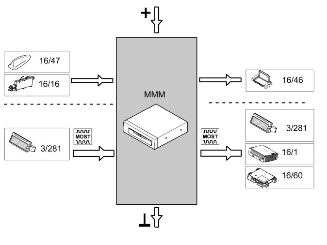 The multimedia module (MMM) communicates with other control modules via the MOST network.