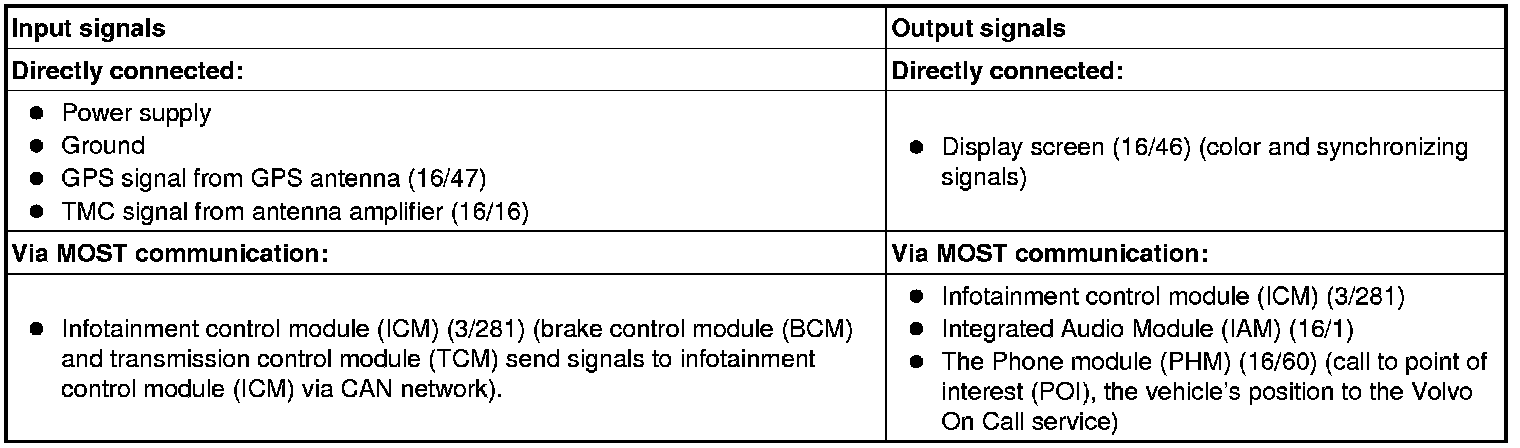 The table below summarizes the input signals to and output signals from the multimedia module (MMM). The signal types are divided into directly connected signals and MOST communication. The illustration below depicts the same information with the Volvo component designations.