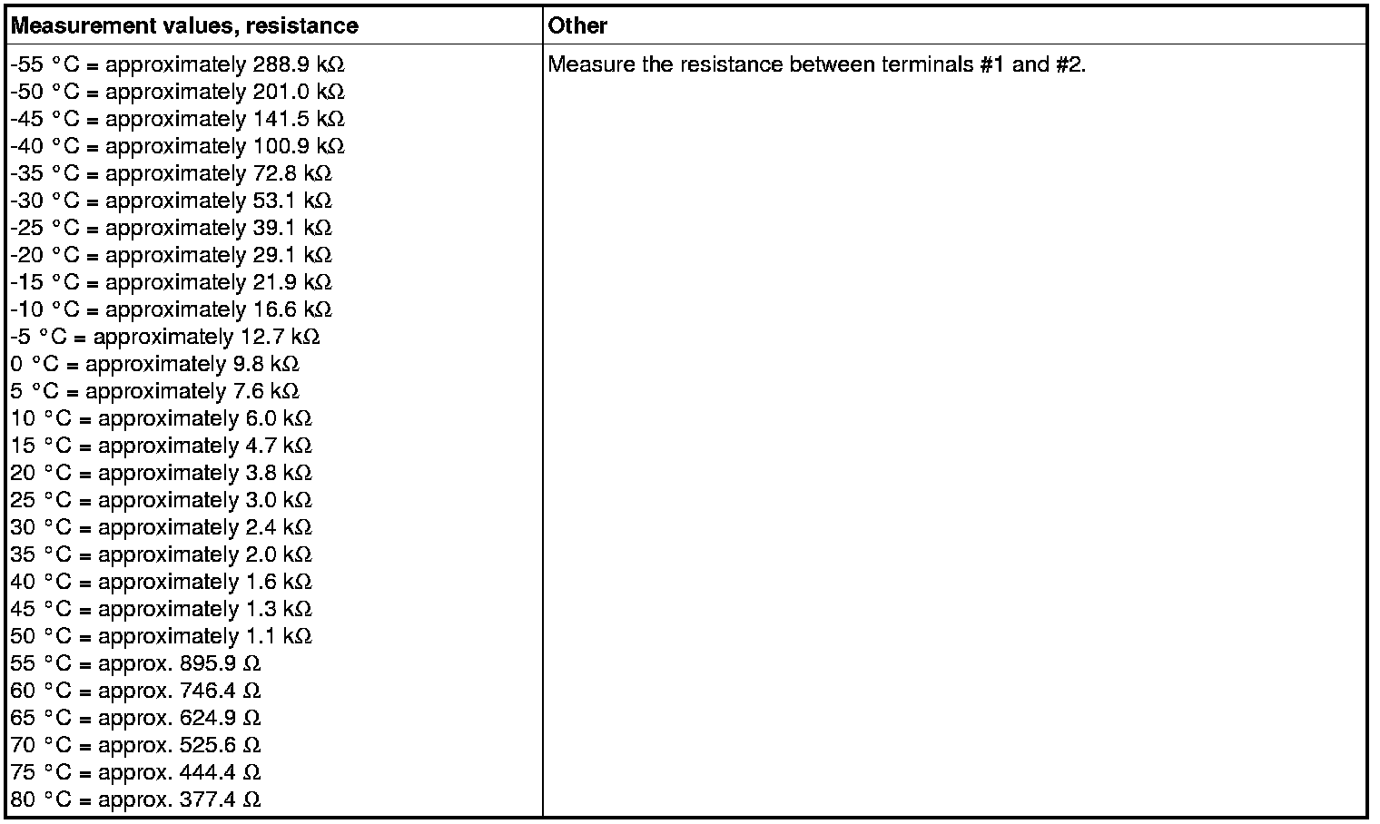 Resistance values, evaporator temperature sensor
