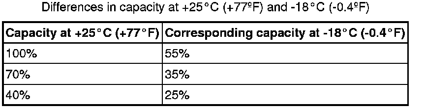 The table shows the difference in capacity in a battery at +25°C (+77°F) and -18°C (-0.4°F).