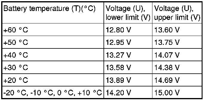 Values for battery temperature and voltage are read and displayed continually during the test. A number of tests are performed in which various battery temperatures are used from -30 °C to +90 °C. Between each battery temperature change, there is a delay of approx. 10 seconds before the voltage is read. This allows the alternator to have time to set the right voltage in relation to the set battery temperature.