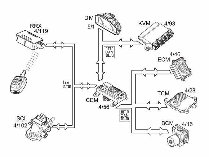 If the keyless vehicle module (KVM) (cars with the keyless entry system only) and central electronic module (CEM) receive a signal from the key-in switch, the identity of the key is checked. This is done either via the keyless system or via the ignition switch. At the same time, the central electronic module (CEM) activates the power supply to the steering column lock module (SCL). After approved validation of the key, the central electronic module (CEM) checks that the engine is not running via CAN signals from the engine control module (ECM). The central electronic module (CEM) also checks that the vehicle is not moving via the CAN signals from the brake control module (BCM) or transmission control module (TCM). If the conditions are met, the central electronic module (CEM) transmits an unlock command to the steering column lock module (SCL). The steering column lock module (SCL) then attempts to unlock the steering wheel lock. If everything is OK, the steering column lock module (SCL) transmits two signals back to the central electronic module (CEM). One signal indicates that the steering column lock module (SCL) has not detected any internal faults and is functioning as intended. The other signal indicates that the spring bolt has moved to the unlocked position. The central electronic module (CEM) will then store an internal value for successful unlocking and then continues with the checks for the immobilizer system.