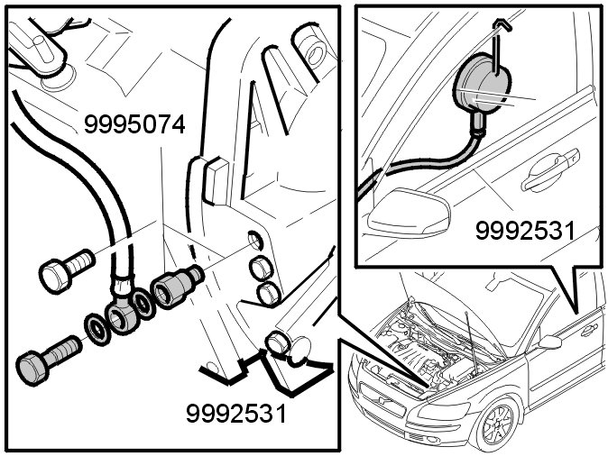 Connect pressure gauge 999 2531 MANOMETER 999 2531 Manometer , insert the pressure gauge's hose down between the transmission and the side member, so that the end of the hose is located near the center of the transmission.