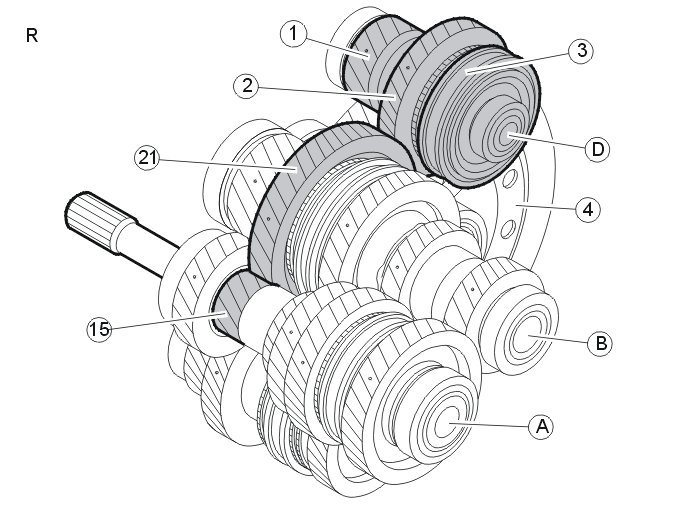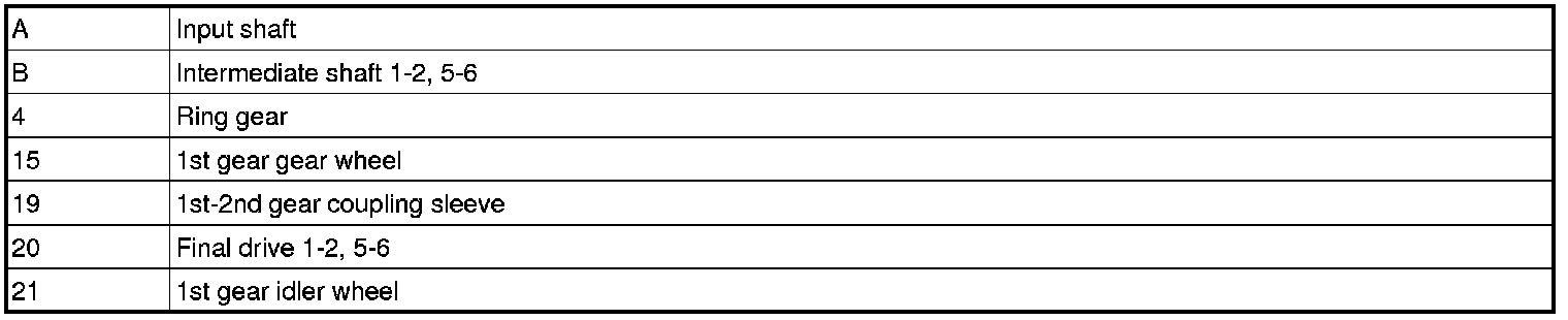 The torque of the engine is transferred via the clutch to the input shaft. The 1st gear gearwheel on the input shaft transfers the power to the idler wheel for 1st gear. From there to the back-up (reverse) gear idler wheel and then to the coupling sleeve for back-up (reverse) gear. From there power is transferred on to intermediate shaft 1-2, 5-6 and to the final drive which in turn transfers the power to the ring gear. The ring gear is connected to the drive shafts through the differential.