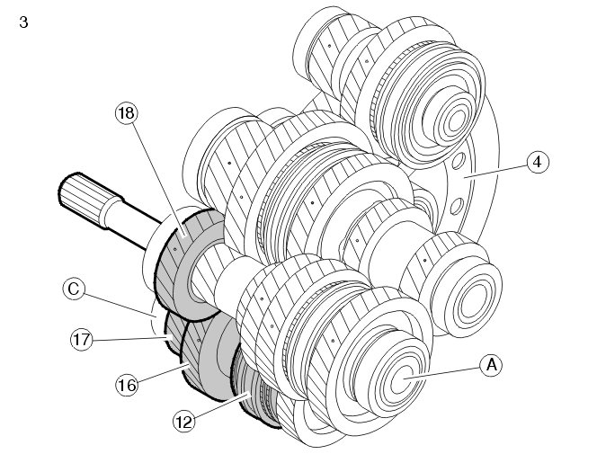 When 6th gear is selected, the coupling sleeve for 5th-6th gear is moved by a gear selector fork along the synchronizing hub towards the idler wheel for 6th gear. The coupling sleeve and synchronizing hub lock the idler wheel for 6th gear at the input shaft.