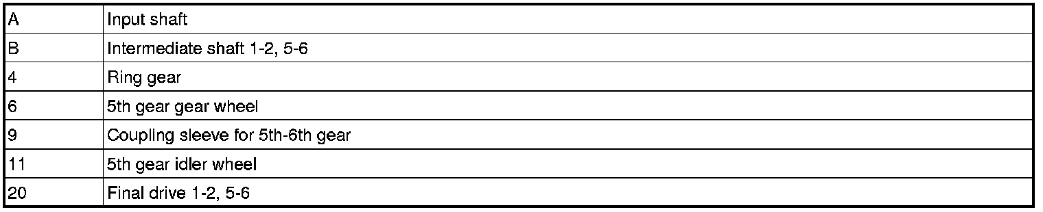 The torque of the engine is transferred via the clutch to the input shaft. The 5th-6th coupling sleeve and 5th gear idler wheel, located on the input shaft, transfer the power to the gear wheel for 5th gear. From there power is transferred on to intermediate shaft 1-2, 5-6 and to the final drive which in turn transfers the power to the ring gear. The ring gear is connected to the drive shafts through the differential.
