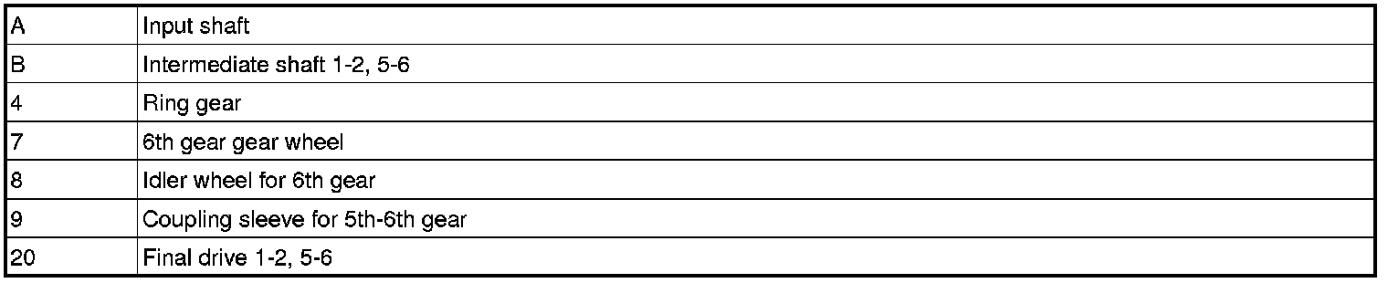 The torque of the engine is transferred via the clutch to the input shaft. The 5th-6th coupling sleeve and 6th gear idler wheel on the input shaft transfer the power to the gear wheel for 6th gear. From there power is transferred on to intermediate shaft 1-2, 5-6 and to the final drive which in turn transfers the power to the ring gear. The ring gear is connected to the drive shafts through the differential.