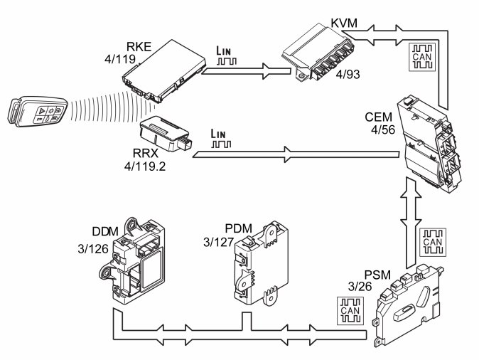 Note! The market in Japan has Remote Keyless Entry (RKE) regardless of if the vehicle is equipped with keyless entry system or not. When the vehicle is not equipped with keyless entry system, the Remote Keyless Entry (RKE) communicates directly with Central electronic module (CEM). If the vehicle is equipped with keyless entry system, the Remote Keyless Entry (RKE) communicates via Keyless Vehicle Module (KVM).