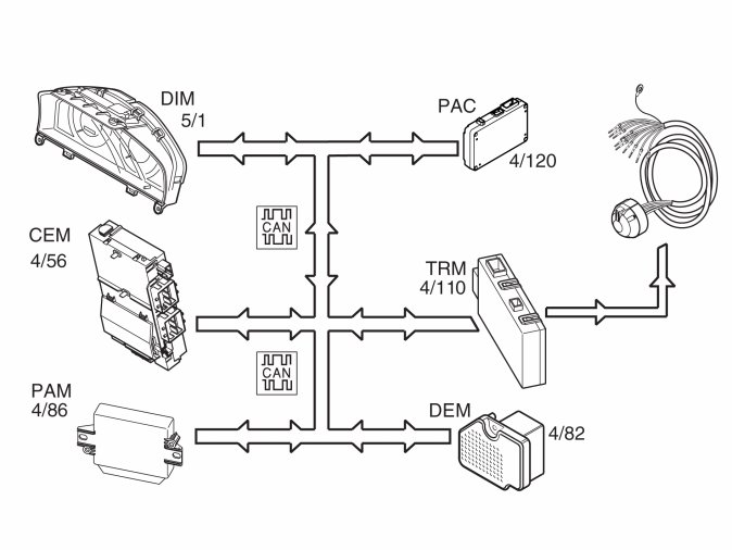 Trailer module (TRM) receives messages on the CAN network, from the central electronic module (CEM) (4/56), about when the turn signal lamps, tail lamps, back-up (reversing) lamp and fog lamps must be activated.