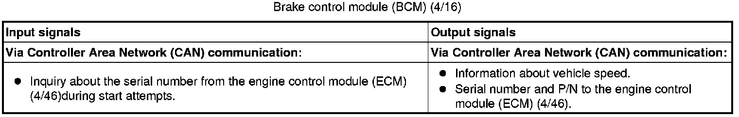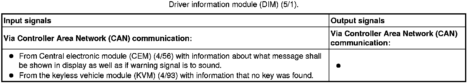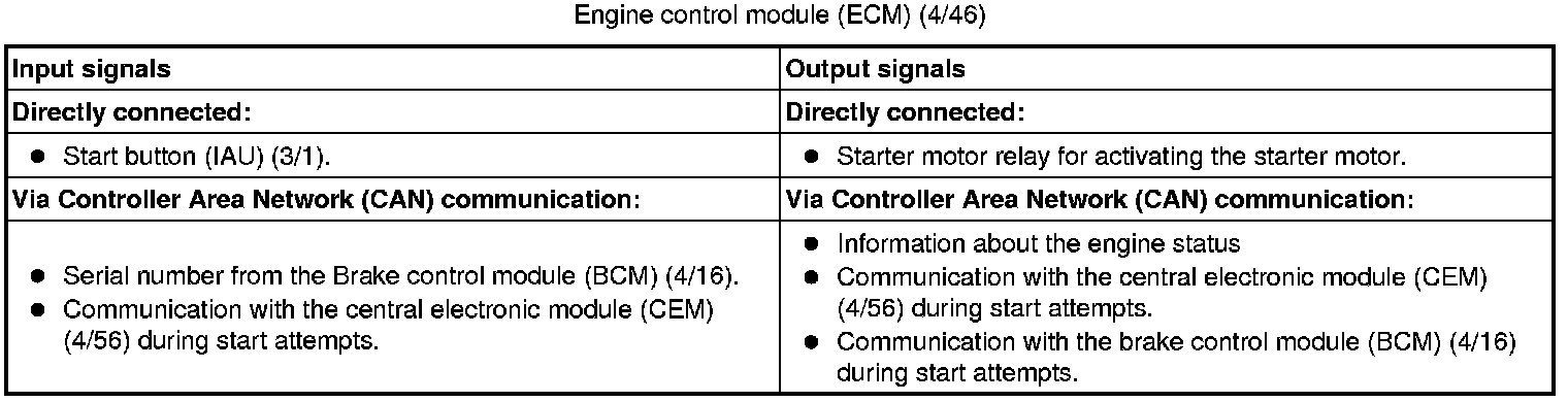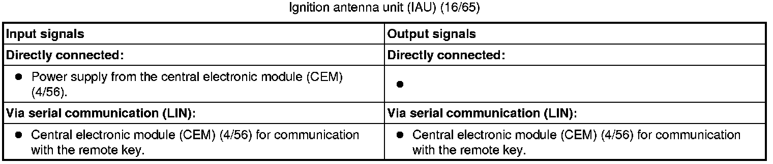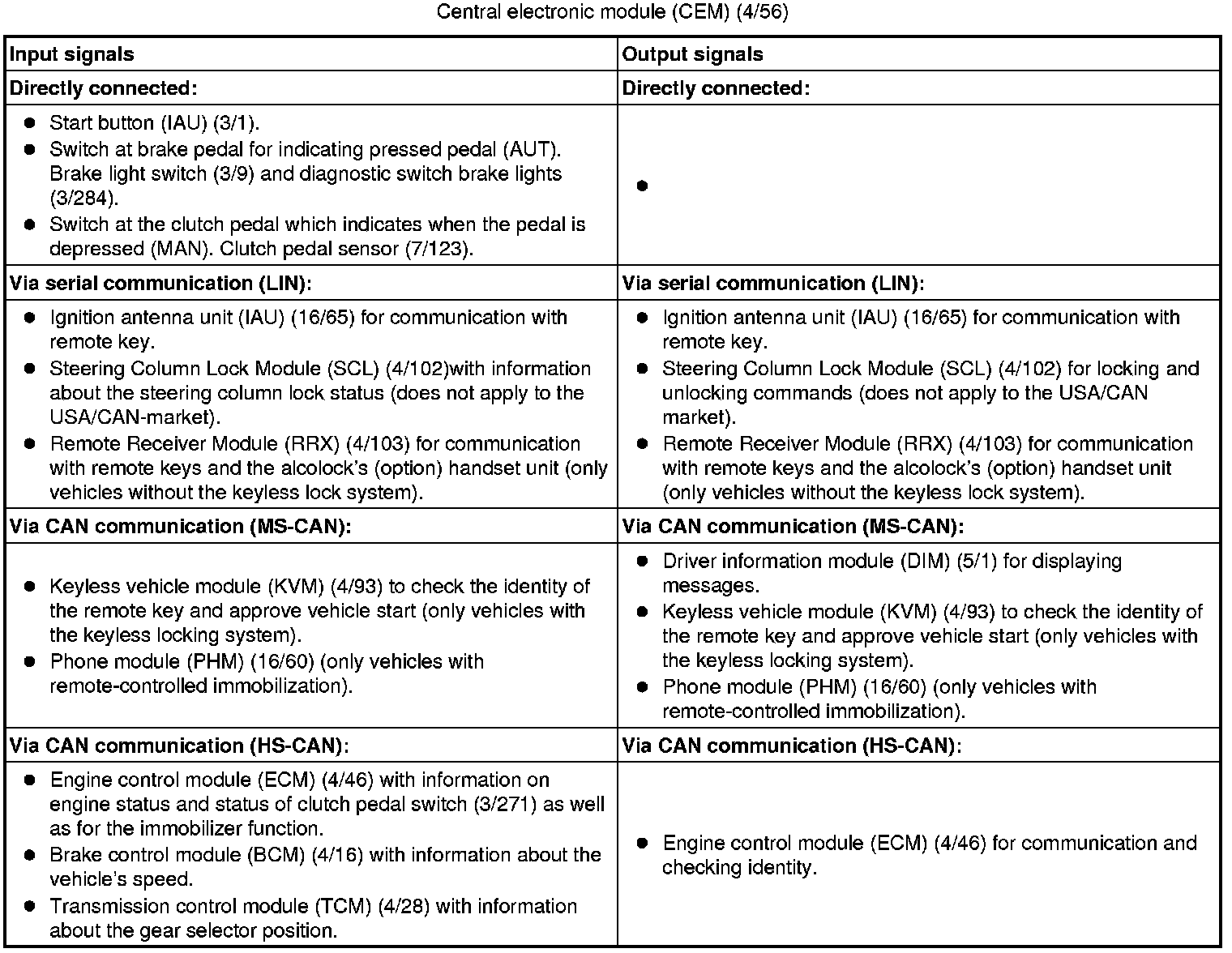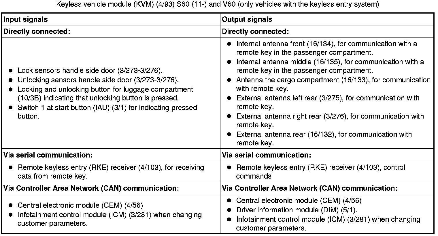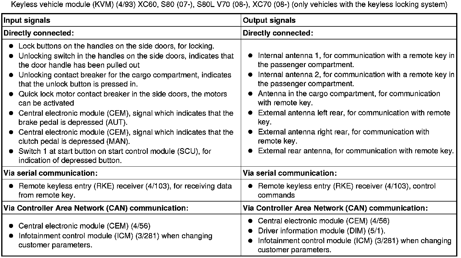 The tables below summarize the input and output signals to the units in the system for the immobilizer. The signal types are divided into directly connected signals, serial communication and controller area network (CAN) communication.