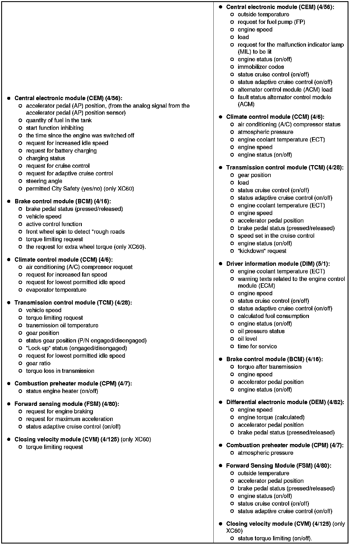 The table below summarizes the input signals to and output signals from the Engine Control Module (ECM). The signal types are divided into directly connected signals, LIN and CAN communication. The illustration below gives the same information as the Volvo component designations.