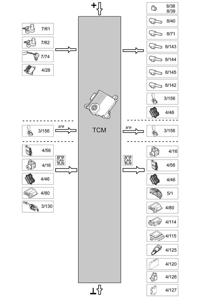 - Transmission control module (TCM) - Controls activation/deactivation of the solenoids by means of processing the input signals from the transmission speed, rpm and temperature sensors. Also stores adaptive data and diagnostic trouble codes and frozen values for diagnostics.