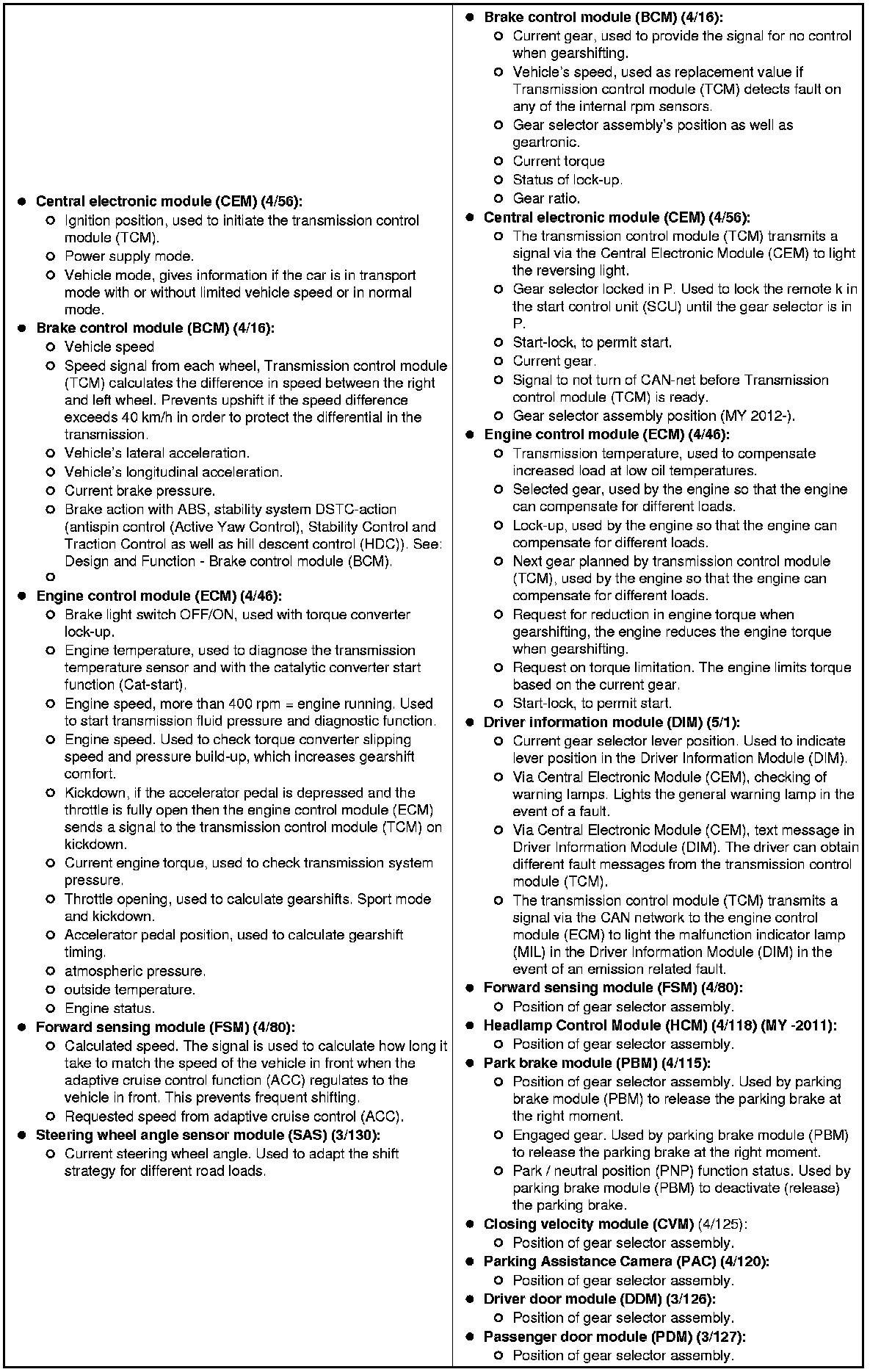 - Gear selector module (GSM) - Provides transmission control module (TCM)information such as Geartronic mode.