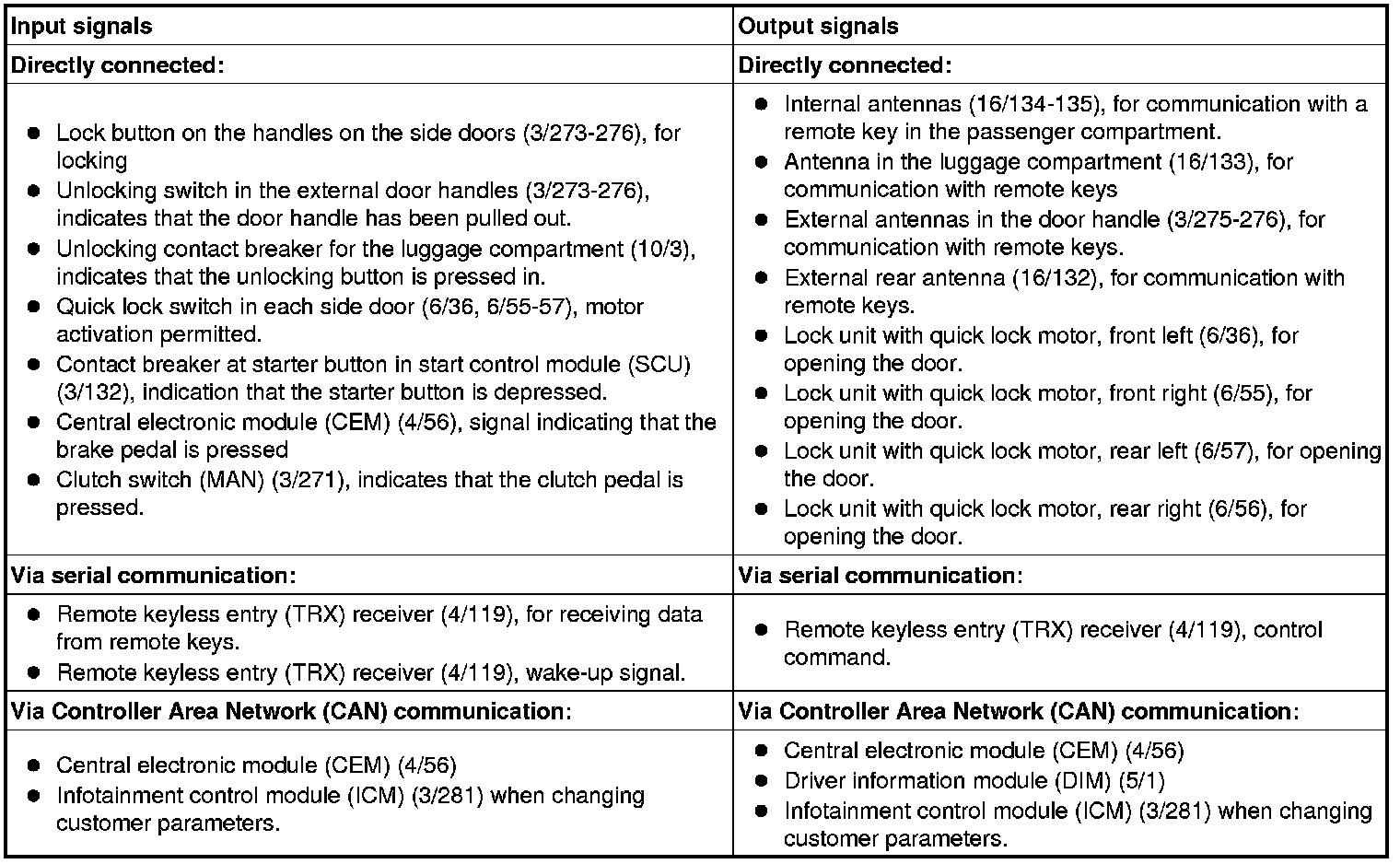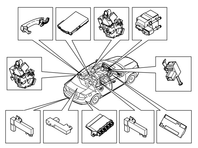 The table below summarize the input signals to and output signals from the keyless vehicle module (KVM). The signal types are divided into directly connected signals, serial communication and controller area network (CAN) communication. The illustration below displays the same information with the Volvo component designations.