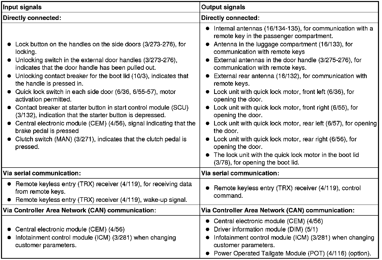 The table below summarizes the input signals to and output signals from the keyless vehicle module (KVM). The signal types are divided into directly connected signals, serial communication and controller area network (CAN) communication. The illustration below displays the same information with the Volvo component designations.