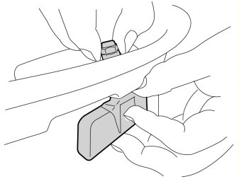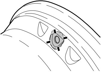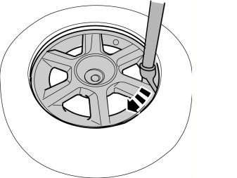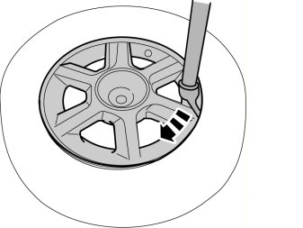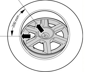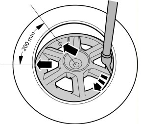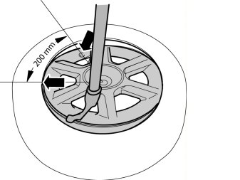 - Position the tire iron and ensure that a distance of 200mm between the valve and the point of contact between the tire and the wheel is maintained. The curved arrow indicates the rotation of the wheel.