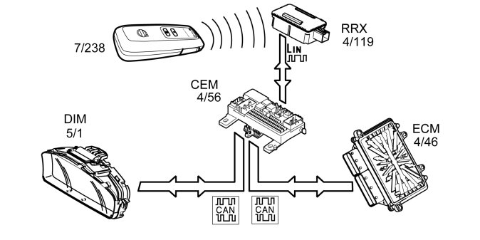 The Alcohol Analyzing Start Inhibitor communicates with the Remote Receiver Module (RRX) wirelessly, just like the vehicle's remote keys. The Remote Receiver Module (RRX) transmits information to the Central electronic module (CEM) via LIN. The Central electronic module (CEM) then communicates via the CAN network with the Driver information module (DIM) and the Engine control module (ECM).