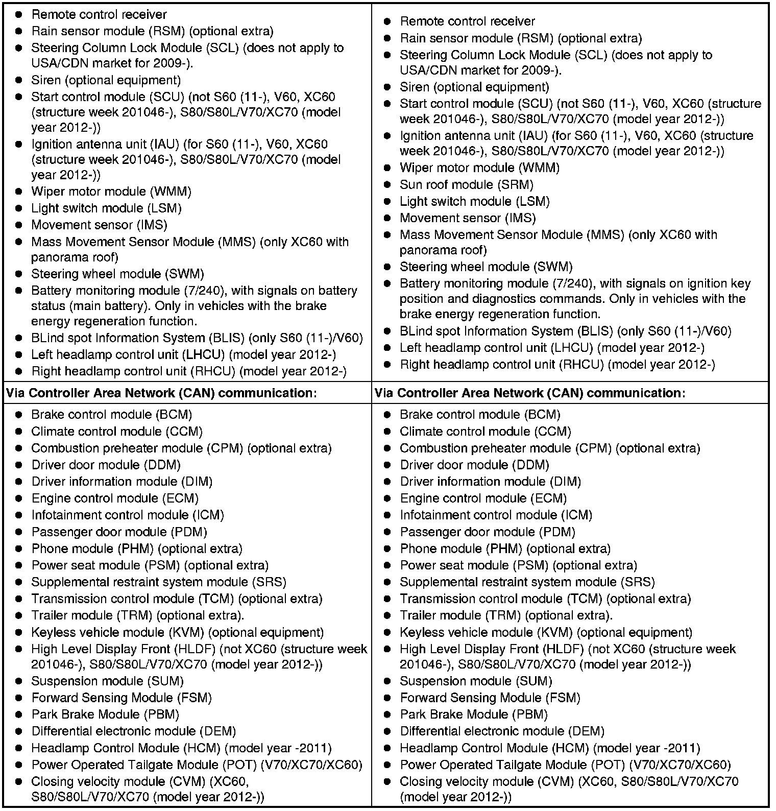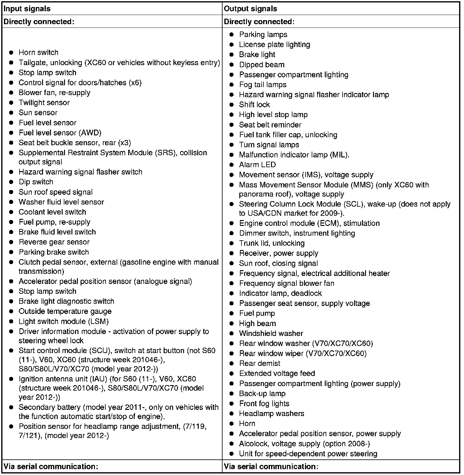 The table below summarizes the input signals to and output signals from the central electronic module (CEM). The signal types are divided into directly connected signals, serial communication and controller area network (CAN) communication.
