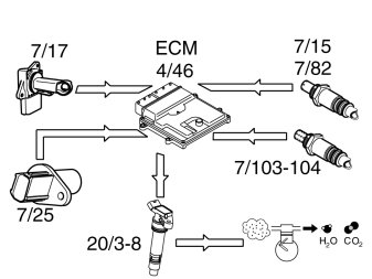 Certain factors, for example, tolerance deviations on certain components such as mass air flow (MAF) sensor and injectors, air leakage on the intake side, fuel pressure etc. affect the fuel / air mix. In order to compensate for this, the engine control module (ECM) has adaptive (self learning) functions. When the engine is new the short term fuel trim varies cyclically around a nominal central line (A) 1.00, with, for example, a ± 5% change of injection time when fuel trim is in operation.