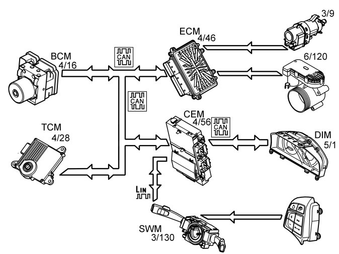 - the steering wheel module (SWM) (3/130) (cruise control buttons), communicates with the central electronic module (CEM) (4/56) via LIN communication.