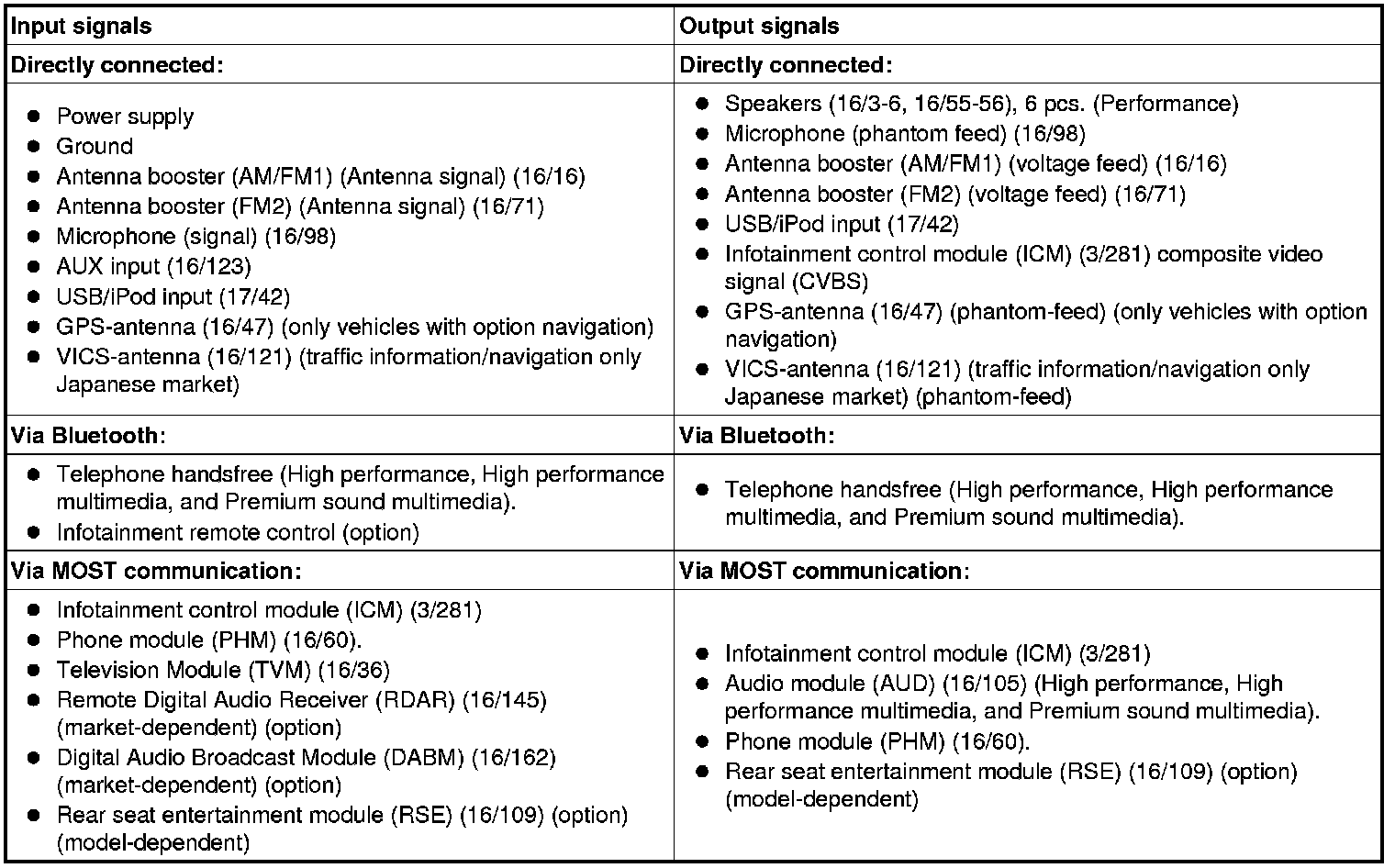 The table below summarizes the input signals to and output signals from the Integrated Audio Module (IAM). The signal types are divided into directly connected signals, bluetooth, and MOST-communication. The illustration below displays the same information with the Volvo component designations.
