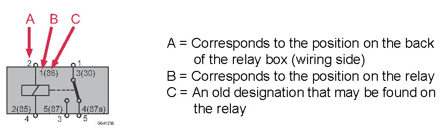 The diagram indicates two or three different designations for the relay's position. This is described below.
