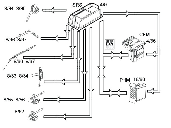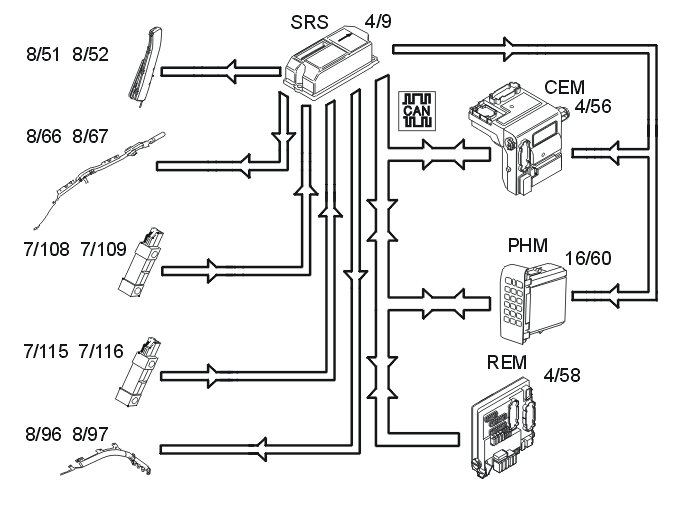 The supplemental restraint system module (SRS) transmits information via the controller area network (CAN) to the driver information module (DIM) (5/1) indicating that this test is in progress. The central electronic module (CEM) (4/56) also transmits the parameter values during the status check.